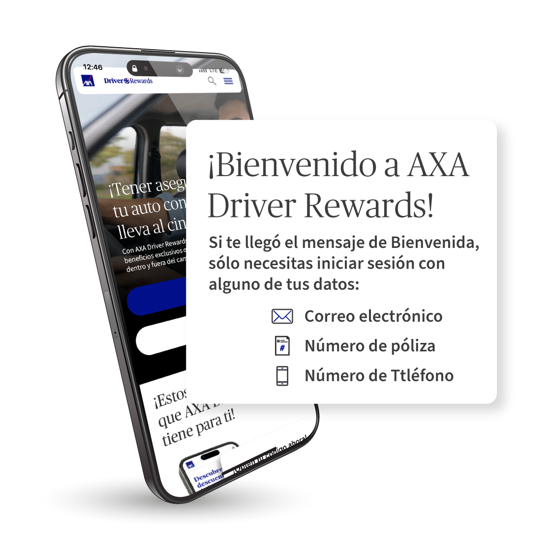 Como eres un usuario precalificado para pertenecer a AXA Driver Rewards, sólo tienes que iniciar sesión alguno de estos datos: con tu número de póliza, correo electrónico o número de teléfono que registraste al contratar tu póliza. Si por alguna razón no puedes ingresar con el número de teléfono o correo electrónico, nuestros asesores te atenderán en el canal de WhatsApp, escribe al 55 9862 8081.